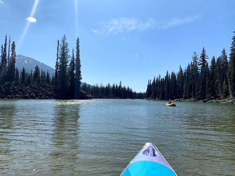 Your adventure begins at the boat launch, where the crisp mountain air greets you, carrying the scent of pine and cool water. The lake stretches wide and shallow, its surface so glassy that the reflections of South Sister and Broken Top seem to shimmer like mirages. Each stroke of your paddle sends ripples dancing outward, breaking the stillness in perfect rhythm with your movements.